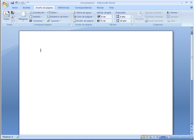 En la que encontramos partes interesantes como: Temas, Configurar página, Fondo de página, Párrafo, Organizar.